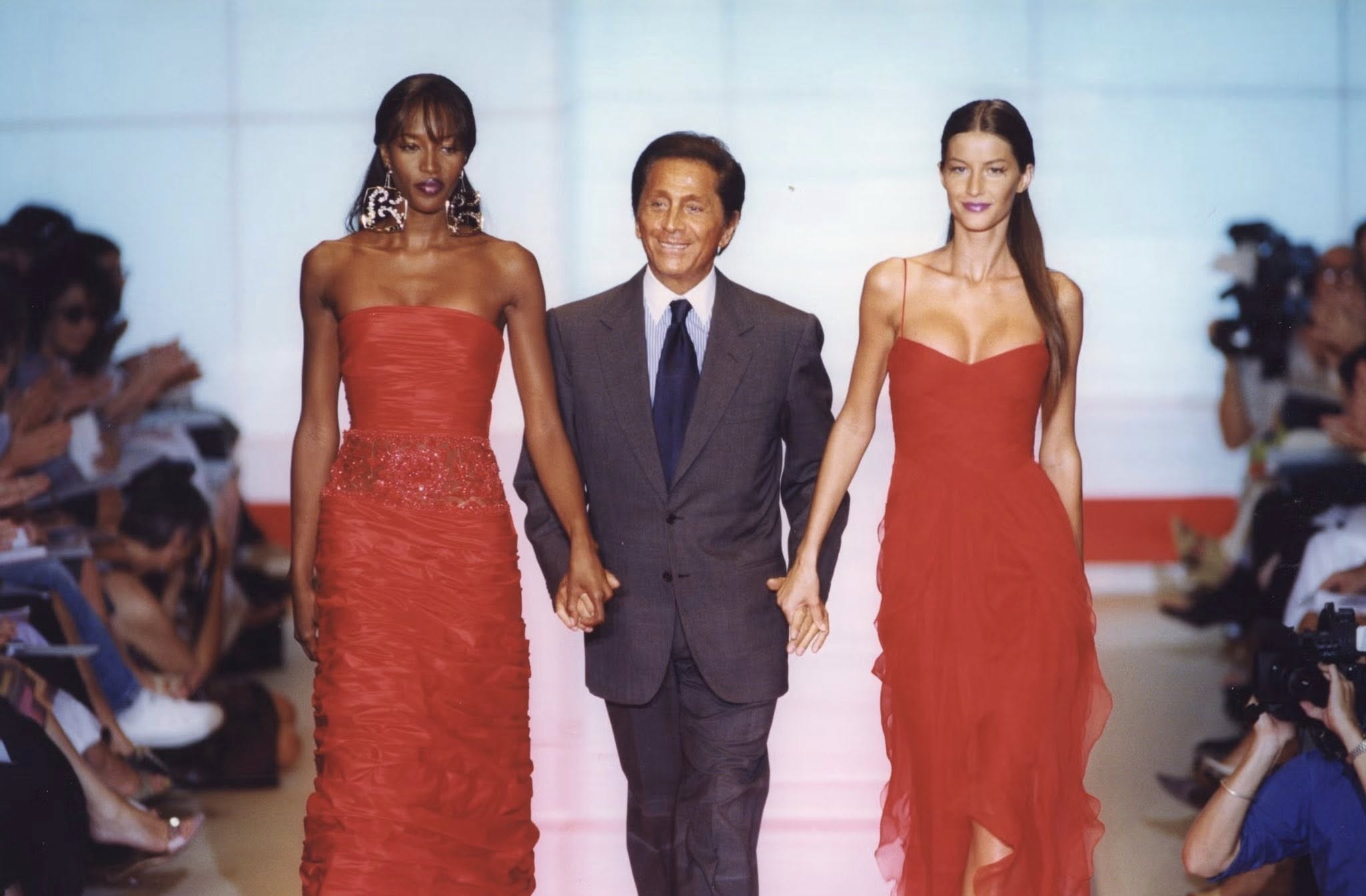 Valentino Garavani 牽著 90 年代兩大傳奇超模 Naomi Campbell(左)與 Gisele Bündchen(右),完美展現了「瓦倫提諾紅」在不同層次與材質下的優雅。