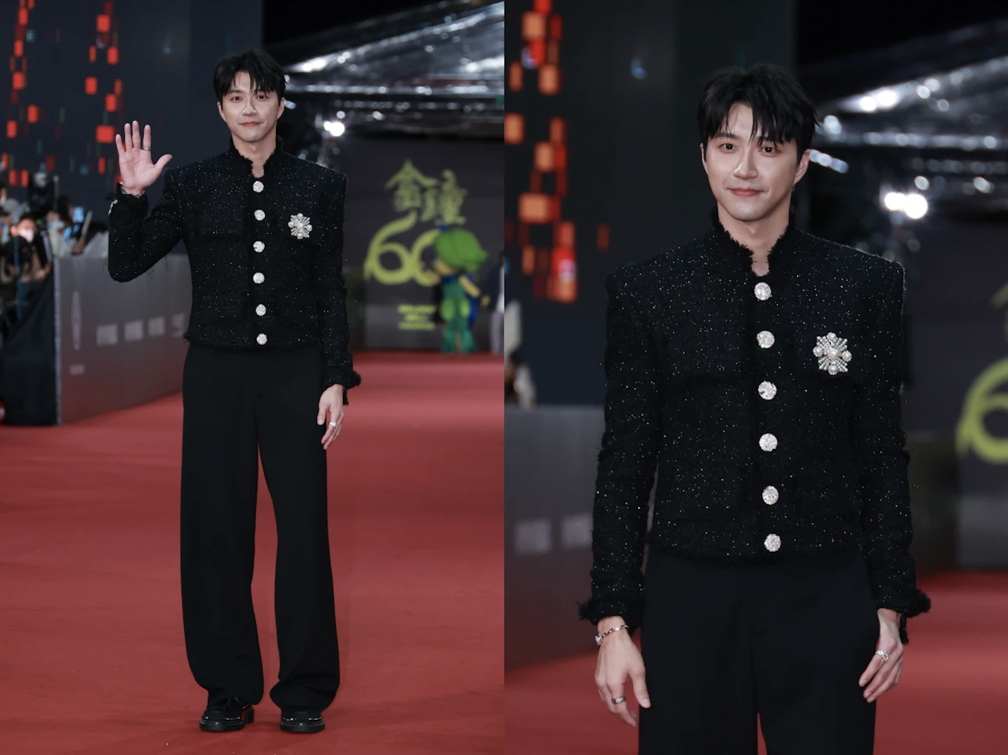 高領和偏大的珠寶飾釦穿在他身上一點都不違和,還能把猶如GD風的短版金蔥外套穿出有別於紅毯男星的味道!