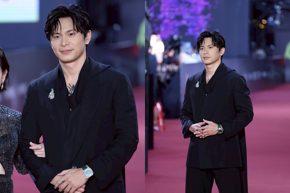全黑西裝搭配跳色飾釦,穩重又有設計感,氣場內斂卻吸睛。